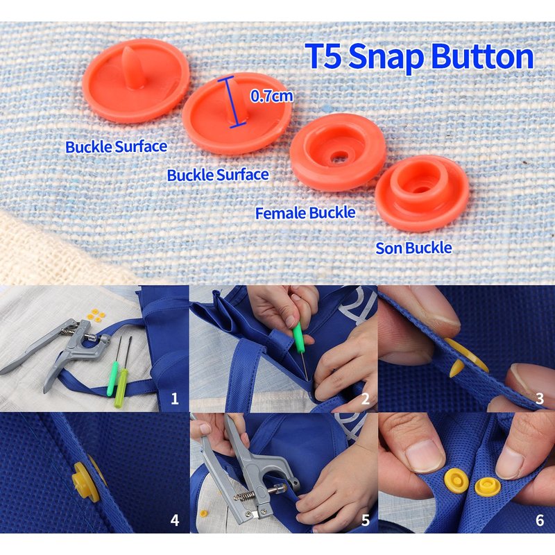 - Each snap button set include 4 parts: 2 caps, 1 socket and 1 stud. Button cap diameter: 12mm (T5) / 0.47 inch. Pliers can work with T3, T5 and T8.