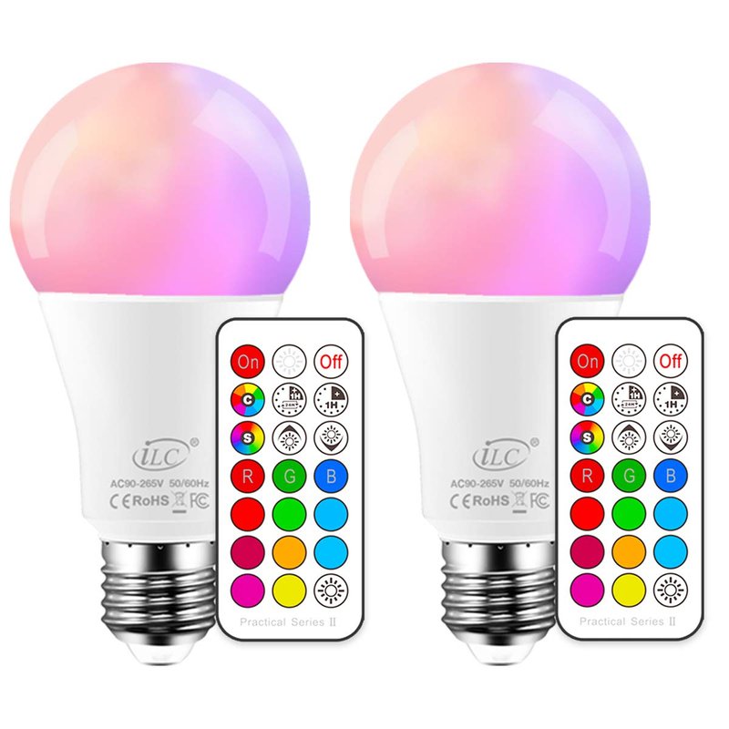 ILC Color Changing LED Light Bulbs, 70W Equivalent, 2700K Warm White A19 E26 Screw Edison Base RGBW Dimmable - 12 Color Choices - Timing Infrared Remote Control Included (2 Pack)