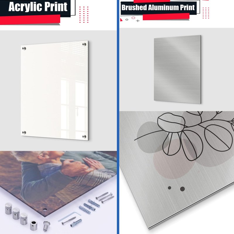 - Brushed Aluminum Prints: Visually striking, polished, and built to last - our stylish aluminum prints are designed with superior quality and a clean finish. Crafted from two white aluminum layers and a black polyethylene compound core in between, our aluminum is lightweight yet strong, making it durable and perfect for larger art pieces. Since the aluminum panel is coated in white, it ensures that the white and bright areas have a faint silky gloss, which is stunning to look at.