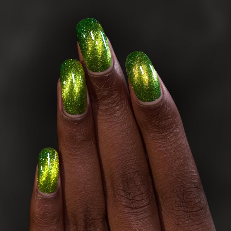 Monster Green Magnetic Holographic Nail Polish Frankie is a monster green nail polish pieced together with lime-green magnetic pigment and scattered holographic micro-flakes. This frightening monster green offers more than what meets the eye. Introduce a magnet and Frankie jolts to life, awakening with a lime-green magnetic streak. Delve deeper than the surface to uncover a radiant holographic twinkle that is often overlooked by the misunderstanding. Frankie is part of the Fright Night Collection, a captivating 6-piece nail polish collection that invites you to join the party! Navigate a labyrinth of color as you ensnare the senses with shimmer, magnetic, and holographic finishes that blur the boundaries between the earthly and the supernatural. Unleash the mysterious magic captured in each bottle of Fright Night and transform your nails into the ultimate accessory for a night when fantasy reigns supreme! We recommend 2-3 coats for the ideal finish Magnetic Wand sold separately