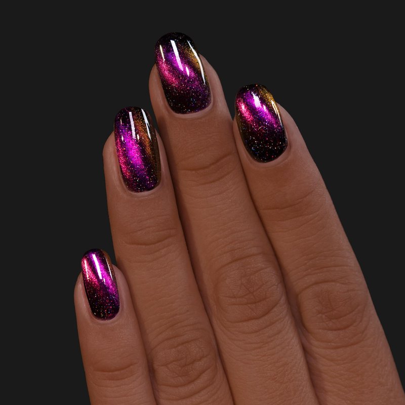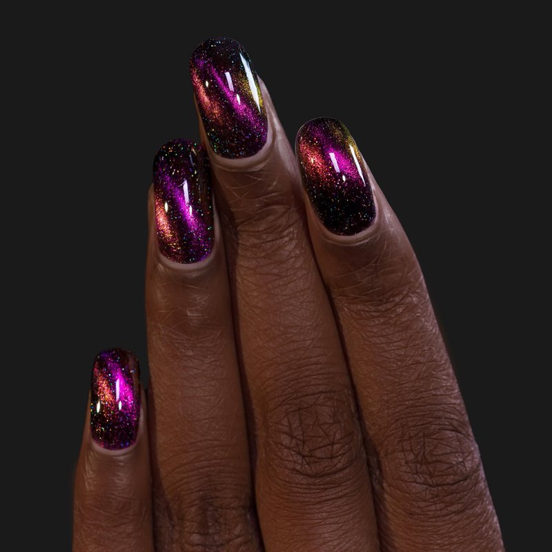 Jet Setter is a black-based pink nail polish with holographic and color-shifting magnetic pigment that will take your manicures to new heights. Jet Setter nail polish is the ultimate accessory for the adventurous and nightlife-loving trendsetter. Its black base transforms under a magnet, shifting from pink, orange, yellow, and at extreme angles, green. Embrace the spirit of late-night soirées, impromptu flights, and unforgettable moments with Jet Setter. Jet Setter is part of the Nightlife Collection, a 6-piece collection where color comes to life at night under the glowing neon lights and the sparkling cityscape. Embrace the exhilarating spirit of Nightlife where bold, bright, and colorful magnetic hues light up against a blackened base for an effect that is nothing short of electrifying! We recommend 2-3 coats for the ideal finish Magnetic Wand sold separately