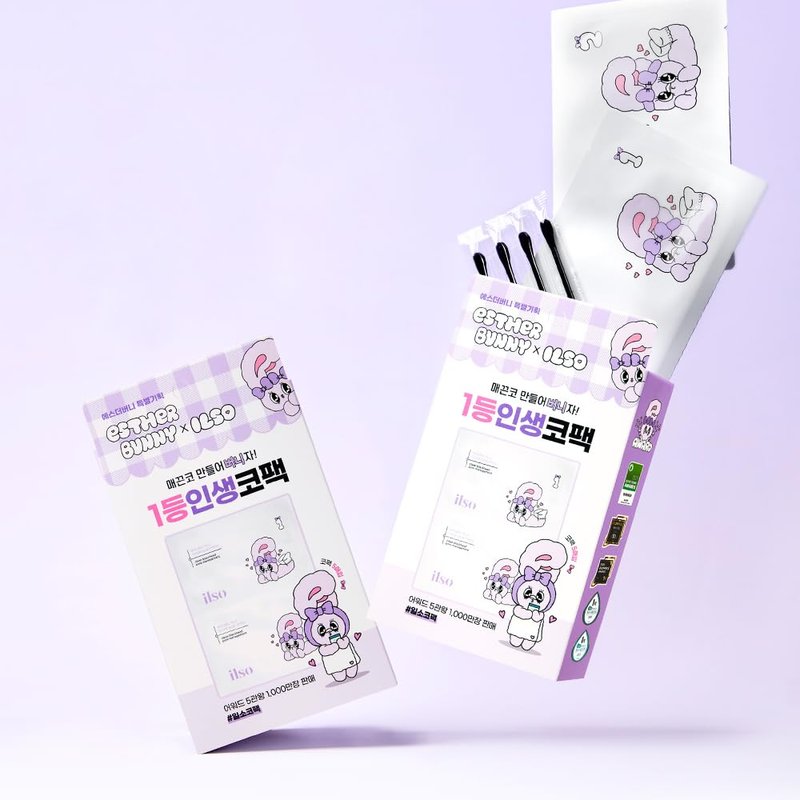 Unveil a radiant complexion with these exfoliating and moisturizing nose patch. This is not a traditional nose strip but a mild nose patch. Crafted with coconut ferment cellulose fabric, they adhere tightly onto the nose, while the spun lace fabric boasts excellent absorbency and adhesion. Infused with 18 earth-derived ingredients, including D-Panthenol for deep moisture and a fruit complex to gently dissolve dead skin cells, these masks not only tighten pores but also soothe and hydrate the delicate eye area. Reveal a refreshed and revitalized appearance with these bunny rabbit eye masks that promote a healthy, glowing skin. This is ILSO Natural Mild Clear Nose Patch in Esther Bunny limited edition.