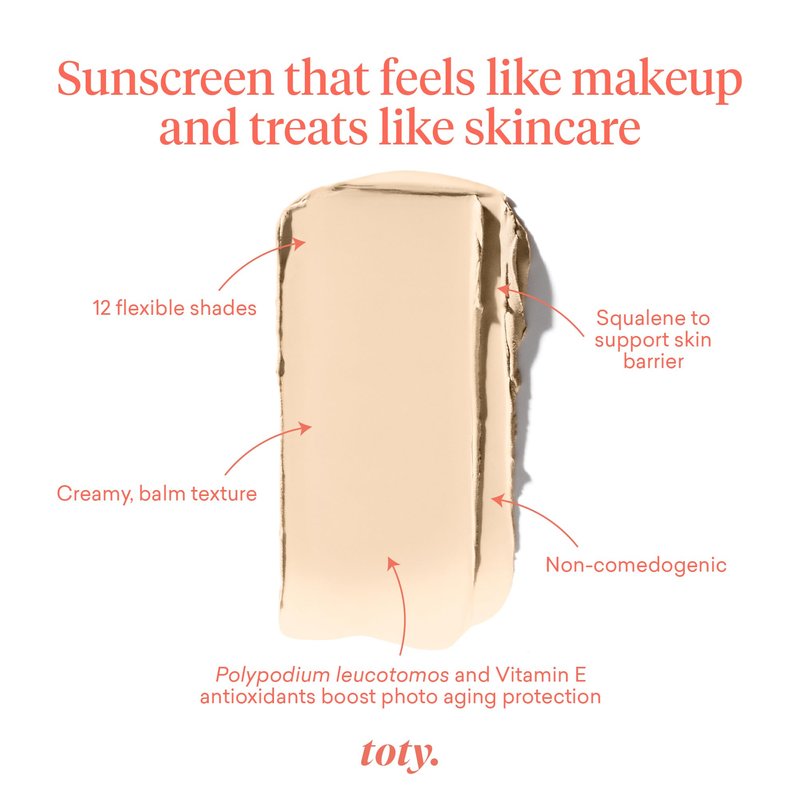 - Why you’ll love it: Sofia’s favorite toty face sunscreen! Suitable for all skin types, including sensitive! Blurs imperfections just like a filter for your face! Don’t be fooled by the compact—this is not powder, but a creamy, yummy foundation balm. Light, non-cakey coverage. Non-comedogenic—no breakouts! Eye safe. Lightly scented so no sunscreen smell. Talc-free. Vegan, cruelty-free, dermatologist tested and free from parabens, every toty product is third-party tested.