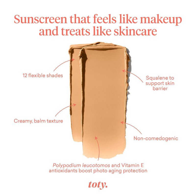 - Why you’ll love it: Sofia’s favorite toty face sunscreen! Suitable for all skin types, including sensitive! Blurs imperfections just like a filter for your face! Don’t be fooled by the compact—this is not powder, but a creamy, yummy foundation balm. Light, non-cakey coverage. Non-comedogenic—no breakouts! Eye safe. Lightly scented so no sunscreen smell. Talc-free. Vegan, cruelty-free, dermatologist tested and free from parabens, every toty product is third-party tested.