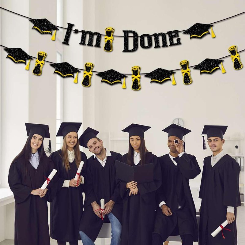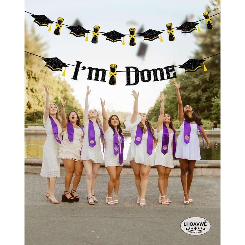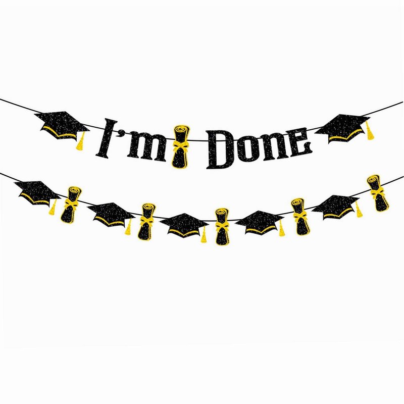 - 【Suitable】Our gold and black 'I'm Done' banner has a wide range of uses. You can hang it on your snack table, dessert table, or buffet table. It can also be hung from a tree or on the front door to match your other orange graduation party decorations and show your congratulations to the graduating class of 2024.
