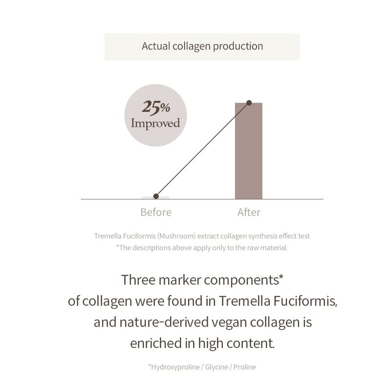 - We got 3 collagens, hydroxyproline, glycine, proline, in tremella fuciformis. Through the PHYTO-ACTIVE method, we improve tremella fuciformis’s actual collagen production 25%.