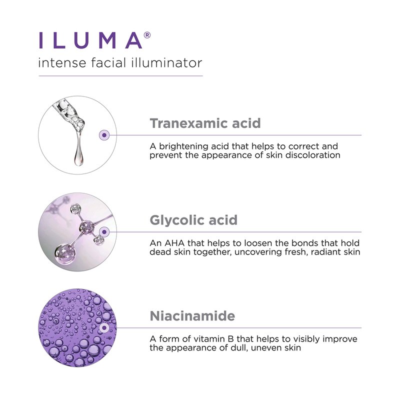 - Tranexamic and glycolic acids to help correct the appearance of dark spots and even skin tone
