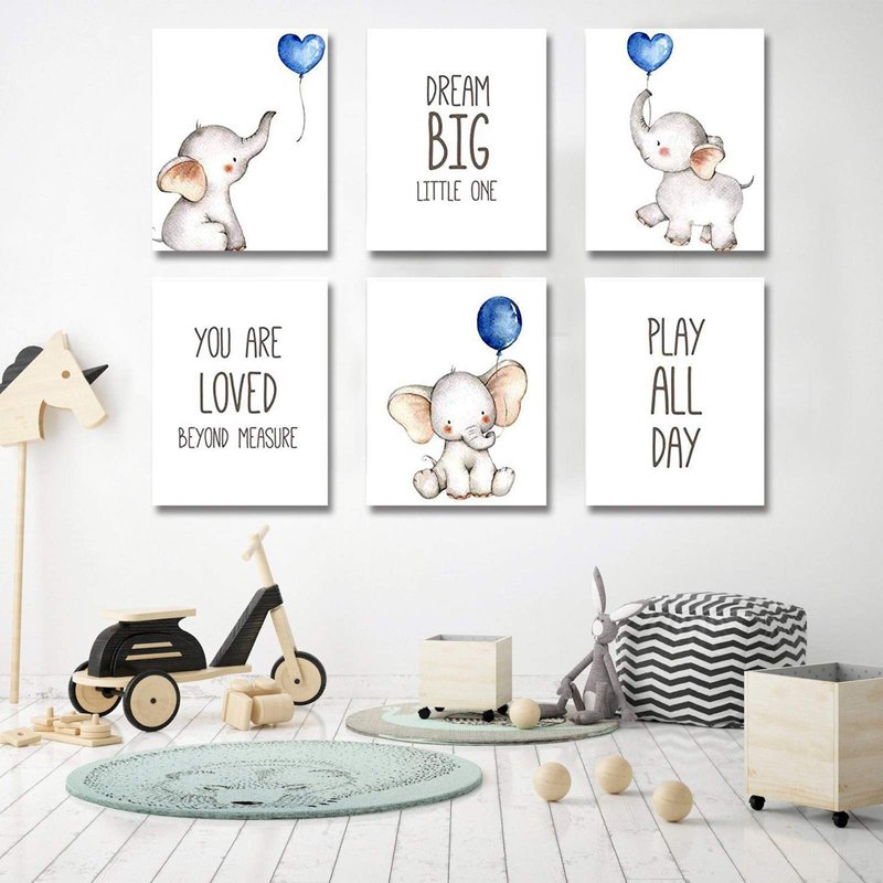 - This set of 6 baby boy nursery art prints featuring 3 adorable elephants holding blue balloons wall art posters and 3 Inspirational saying wall art prints . These prints would be a precious and beautiful way to decorate a baby nursery or little a little boy or girls room! room! These prints would also be a fun and cute way to decorate a playroom, or even to give as a baby shower gift!
