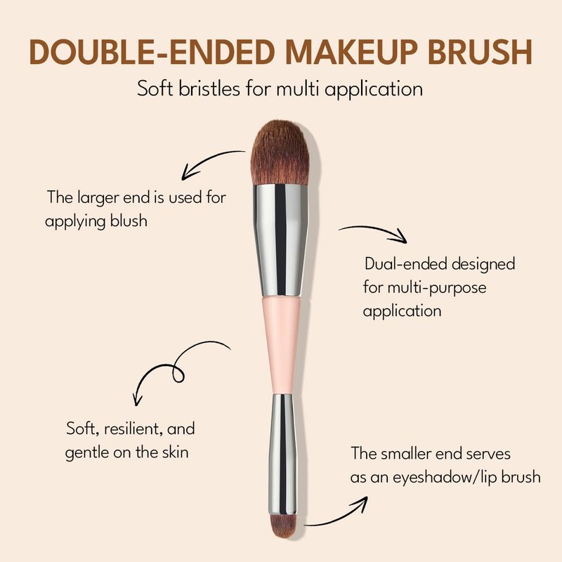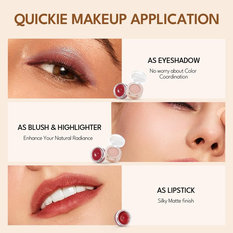 Blush cream set for cheeks, lips and eyes, which includes a multi-purpose cream and a dual-ended brush. The first layer of the lip and cheek cream is a light-colored shimmer, suitable for layering as eyeshadow or used as a highlighter; the second layer is a creamy, matte texture that is smooth and lightweight, ideal for use as blush, eyeshadow, or lipstick. Paired with the dual-ended brush, it allows for quick makeup application without worrying about color matching, saving time. Its small size is convenient for carrying and touch-ups on the go.