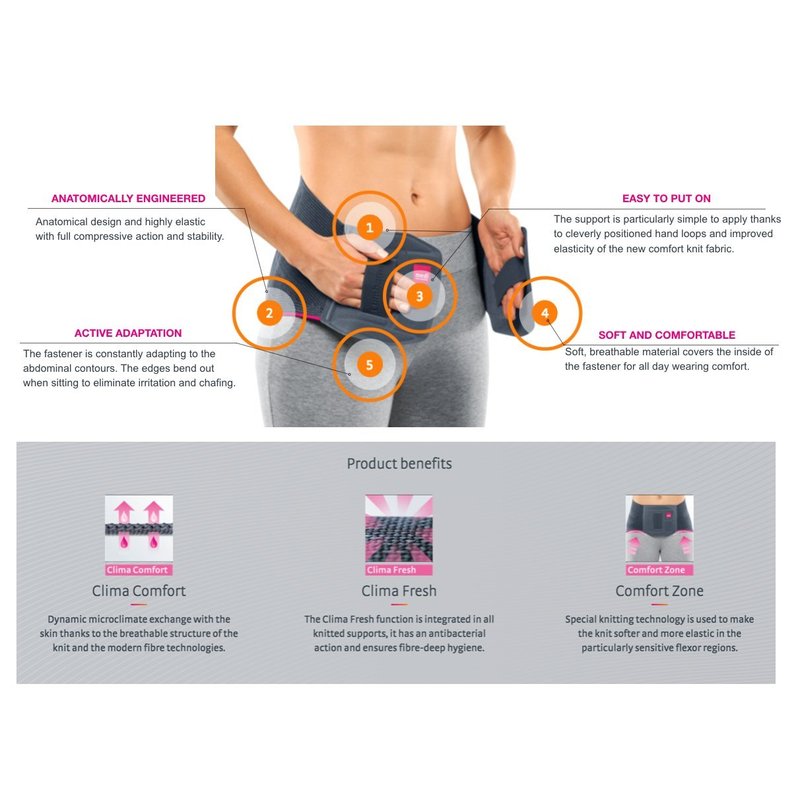 - The compressive fabric and integrated back rods of the Lumbamed Basic stabilize the area of the lumbar spine and the border to the pelvis, without impairing muscle strength. Highly elastic, breathable, moisture-wicking Clima Comfort fabric