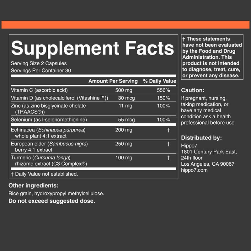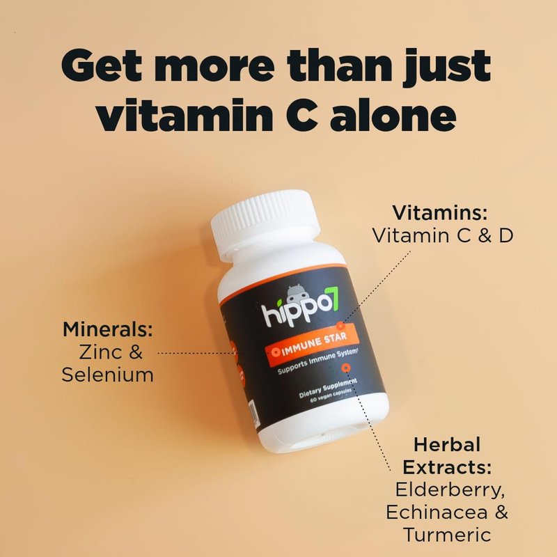 Immune Star by Hippo7. 7-in-1 Immune System Support. Vitamin D, Zinc, Echinacea, Elderberry, Vitamin C, Turmeric & Selenium. (1 Bottle, 60 Capsules)
