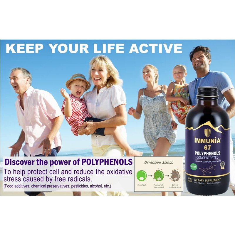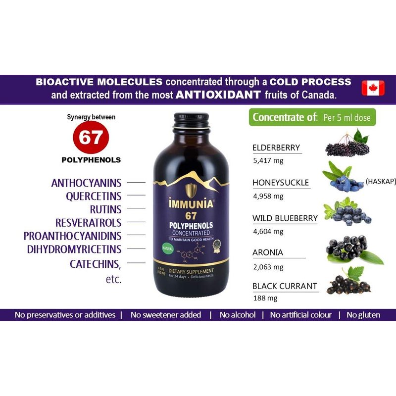 - IMMUNIA 67 polyphenols is an elderberry supplement that helps modulate and regulate the immune system* to preserve good health. It is a polyphenol supplement that ensures you obtain a good intake of ANTIOXIDANTS provided by elderberries and four other antioxidant berries. To improve and maintain optimal health*.