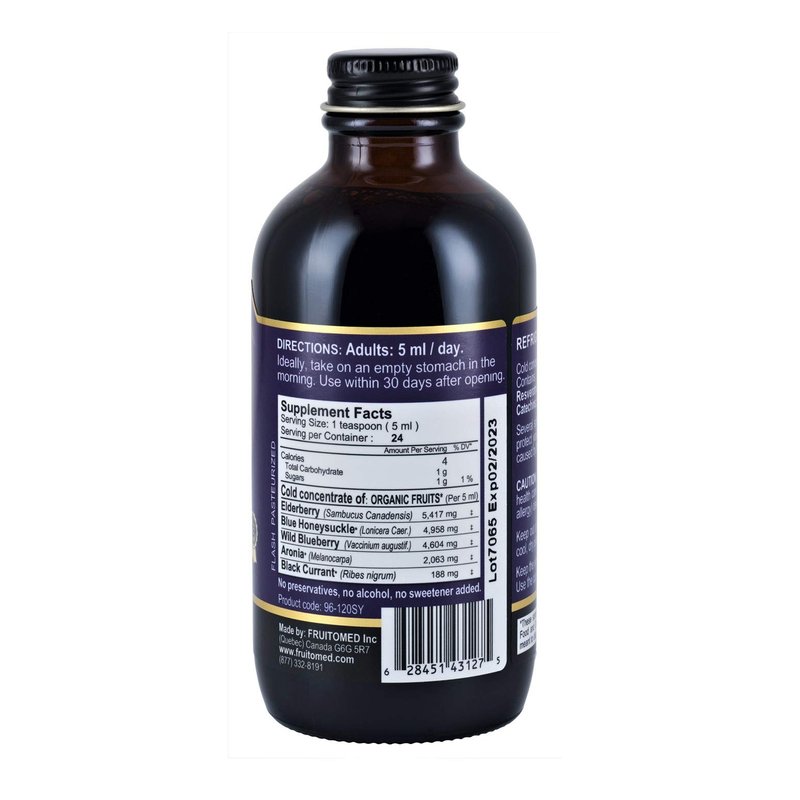 - Ingredients (per 5 ml dose): Canadian Elderberry (5,417 mg), Haskap berry (4,958 mg), Wild blueberry (4,604 mg), Aronia (2,063 mg) and Black currant (188 mg). 100% natural. No additives. No sugar or sweetener added. No alcohol or artificial colour. Gluten-free. Highly concentrated extract through a cold process to preserve the polyphenols antioxidant properties.