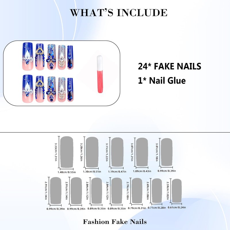 - [Quality Material] These luxury blue rhinestone press on nails are made of quality acrylic material, non-toxic and gentle to your nails and skin, not easy to be scratched, will give you a nice manicure experience.