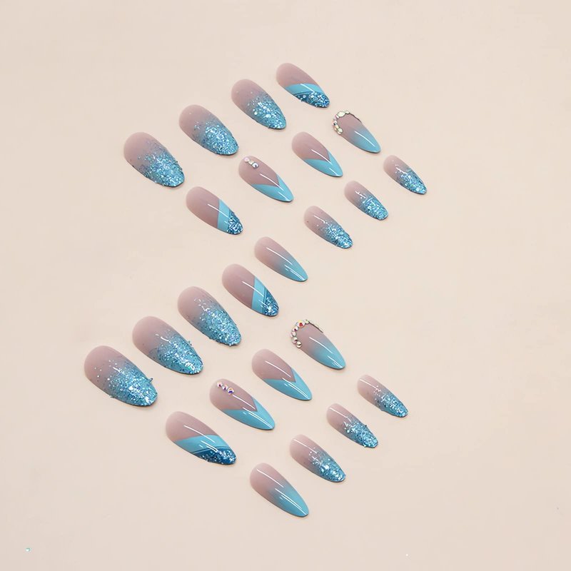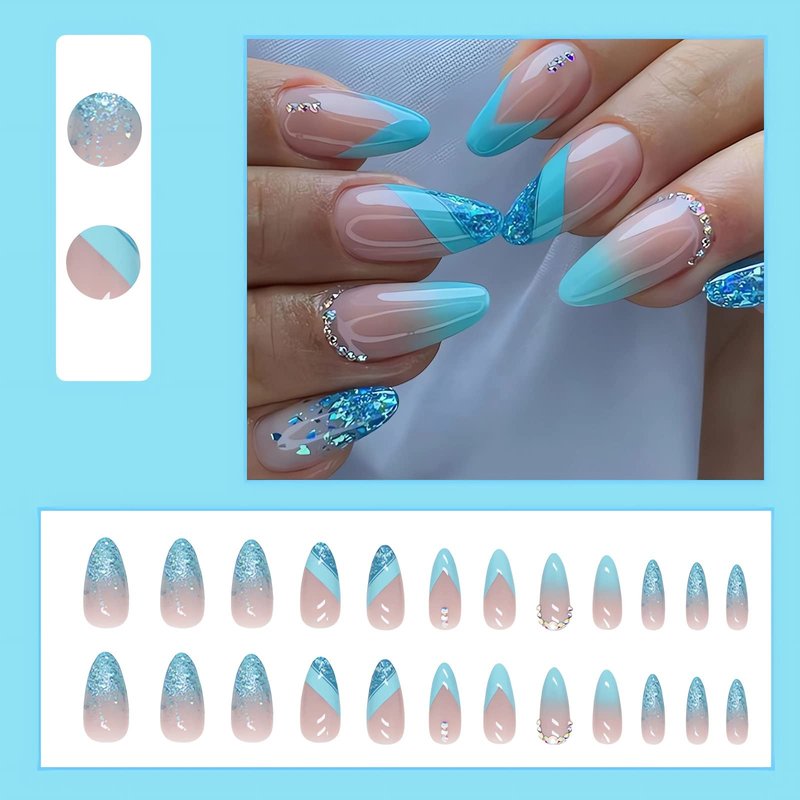 IMSOHOT Almond Press on Nails French Medium Blue Fake Nails Glitter Gradient False Nails with Designs Rhinestone Full Cover Acrylic Nails Glossy Glue on Nails for Women 24pcs