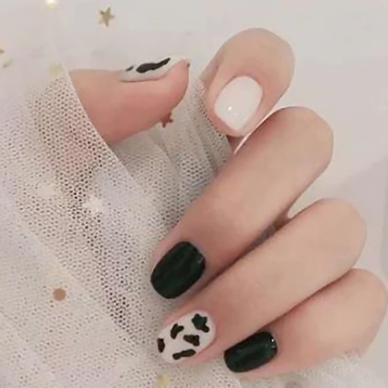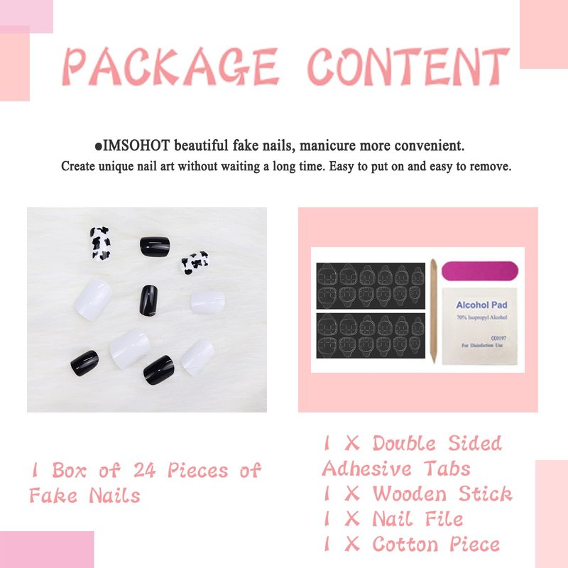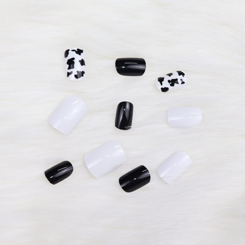 IMSOHOT Glossy Square Press on Nails Short Squoval Cow Print Nails Cute Black Fake Nails False Nails Full Cover Glue on Nails for Women and Girls