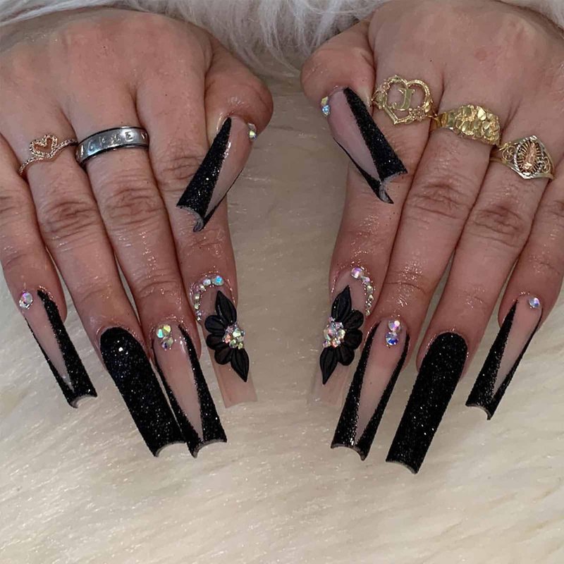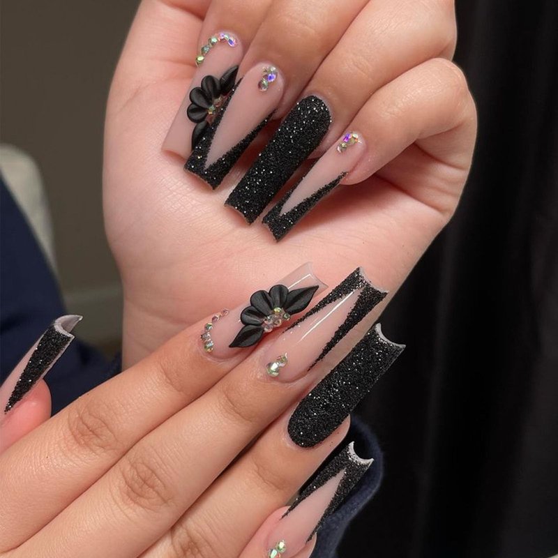 IMSOHOT Press on Nails Long Square Fake Nails Black French False Nail Tips Glossy Acrylic Nails with 3D Flower Charms Designs Full Cover Rhinestones Glitter Glue on Nails for Women 24Pcs