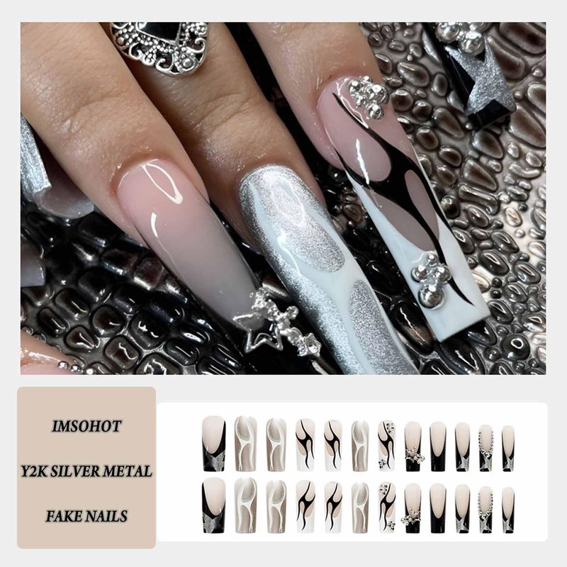 IMSOHOT Press on Nails Long Square Shape Fake Nails Full Cover Y2K Black White Acrylic False Nails with Bling Metal Charms Designs Glossy Glue on Nails French Nail Tips for Women and Girls 24Pcs