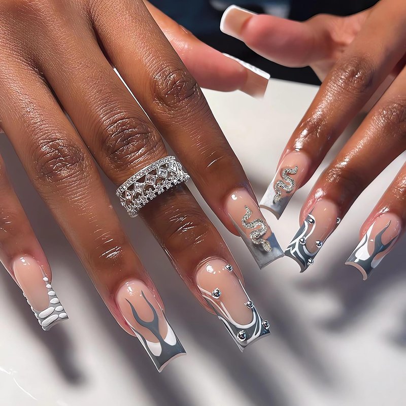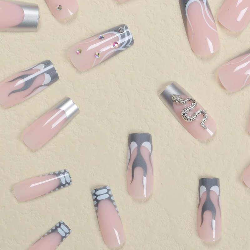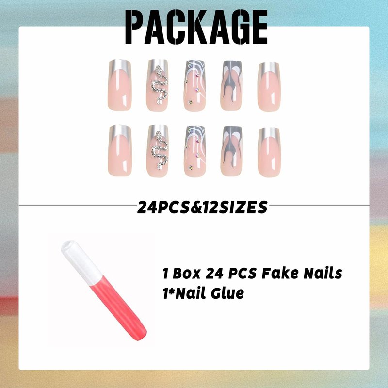 IMSOHOT Square Press on Nails Long French Tips Fake Nails Silver Flame False Nails with Metal Snake Charms Designs Rhinestone Full Cover Acrylic Nails Glossy Glue on Nails for Women 24Pcs