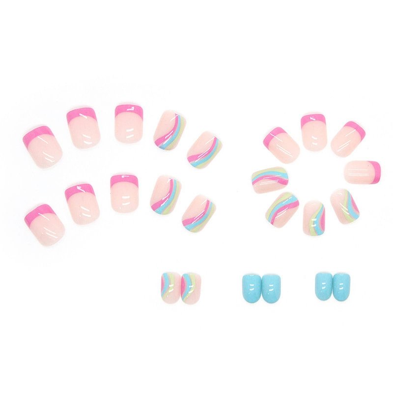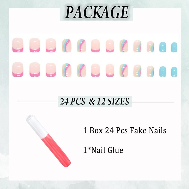 IMSOHOT Square Press on Nails Short French Tips Fake Nails Pink Blue Acrylic False Nails with Rainbow Designs Full Cover Glossy Glue on Nails for Women and Gilrs 24Pcs