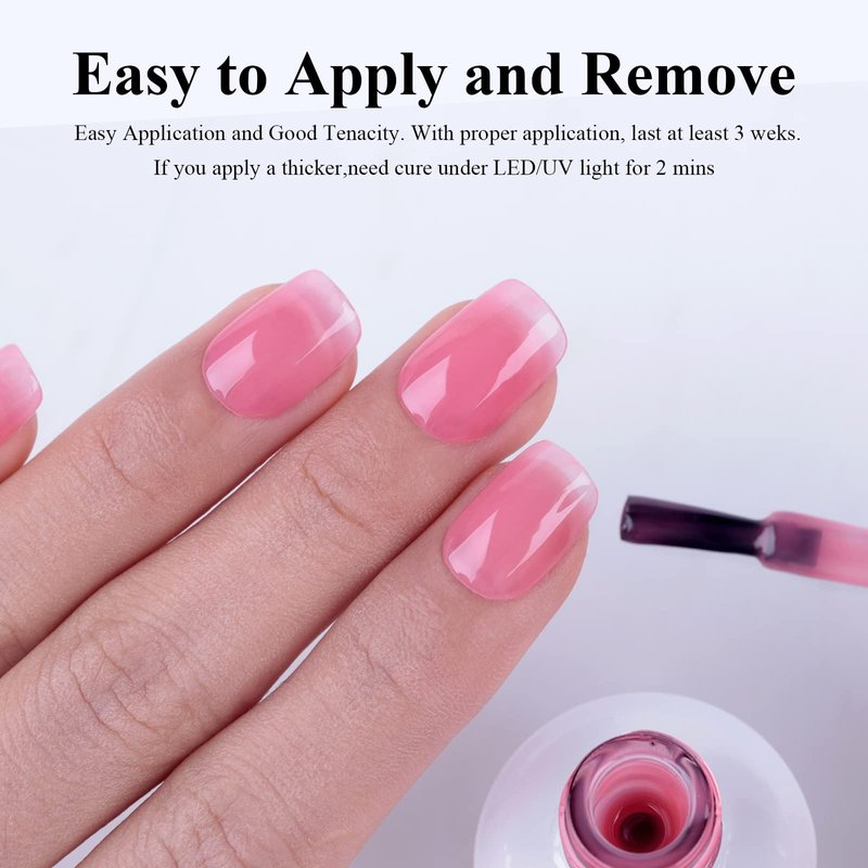 - 💎 Gel nail polish: 1 Pcs 15ml (0.5oz) Big Capacity Jelly Pink nail gel polish ,Sheer Pink gel nail polish creates an understated yet premium translucent nude style for you.It can be used for daily life, work and dating. You can also use it as a base color to create your own French nail art.