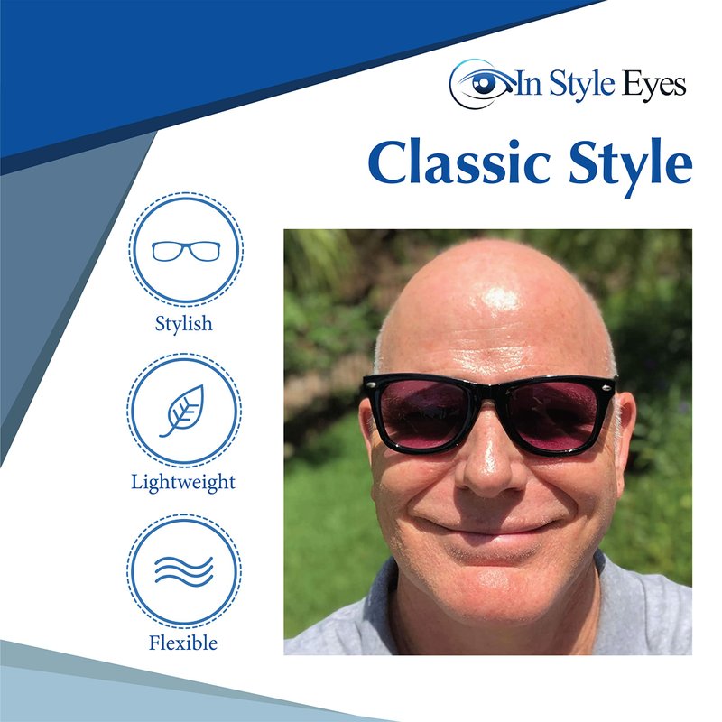 In Style Eyes takes pride in designing quality and stylish solutions to common eyesight needs, helping to create a world where we all can see clearly and look great doing so. In Style Eyes' EyeCool classic sunglass readers for women and men provide all-day protection from the bright sun while helping you to see up close at the same time. These trendy non-polarized reading sunglasses are designed for long-term wear. The frames are made from lightweight plastic. This means they are durable and comfortable for all-day wear. These non-bifocal, full-lens magnification sunglasses readers women and men come with uniform black colored lenses, with a moderate tint. This protects your eyes from high light while not creating a low light situation where you have trouble reading. Frames come in black and tortoise and are a classic sharp style suitable for either a man or a woman. They're perfect for spending a day out on the lake fishing or reading the newspaper at an outdoor cafe or any outdoor situation where you need to read like plant shopping or reading cage signs at the zoo with family. In Style Eyes is serious about protecting your vision! Non-polarized lenses have a medium-rated tint, and offer a maximum of UV 400 protection. Lenses are made from lightweight aspheric plastic, rather than acrylic, and are 55 millimeters wide. Magnification strengths range from 1.0x to 3.5x, with quarter diopter increases in between. These reading glasses for men and women are men's and women's One Size Fits Most, and are perfect for anyone wanting to add a touch of cool to their wardrobe. Stop straining and give your eyes the support they need to help you see up close with these comfortable non-bifocal readers for women and men.