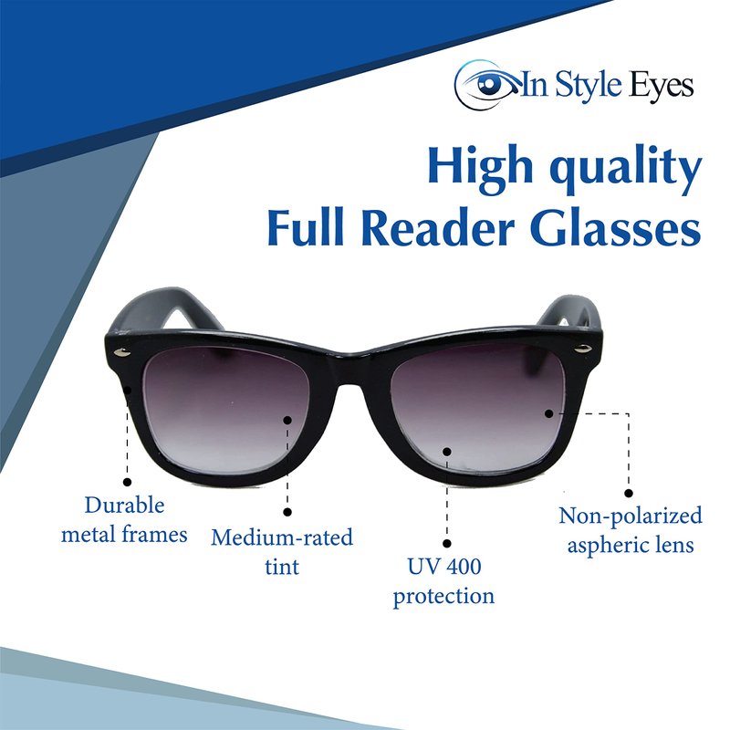 - Stylish full reader sunglasses - In Style Eyes’ non-bifocal sunglass readers for women and men are stylish and durable, made with high-quality lenses and frames. Designed with lens power ranging from 1.0x to 3.5x, they look great on anyone's face.