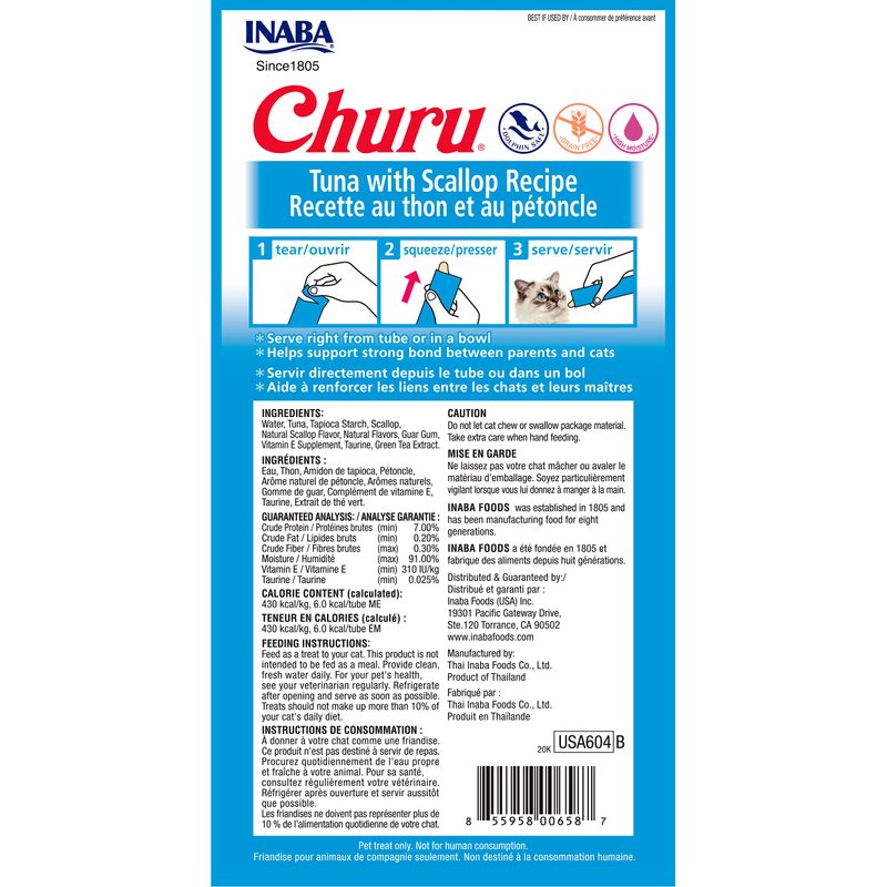 INABA Churu Cat Treats, Grain-Free, Lickable, Squeezable Creamy Purée Cat Treat/Topper with Vitamin E & Taurine, 0.5 Ounces Each Tube, 12 Tubes (4 per Pack), Tuna with Scallop Recipe