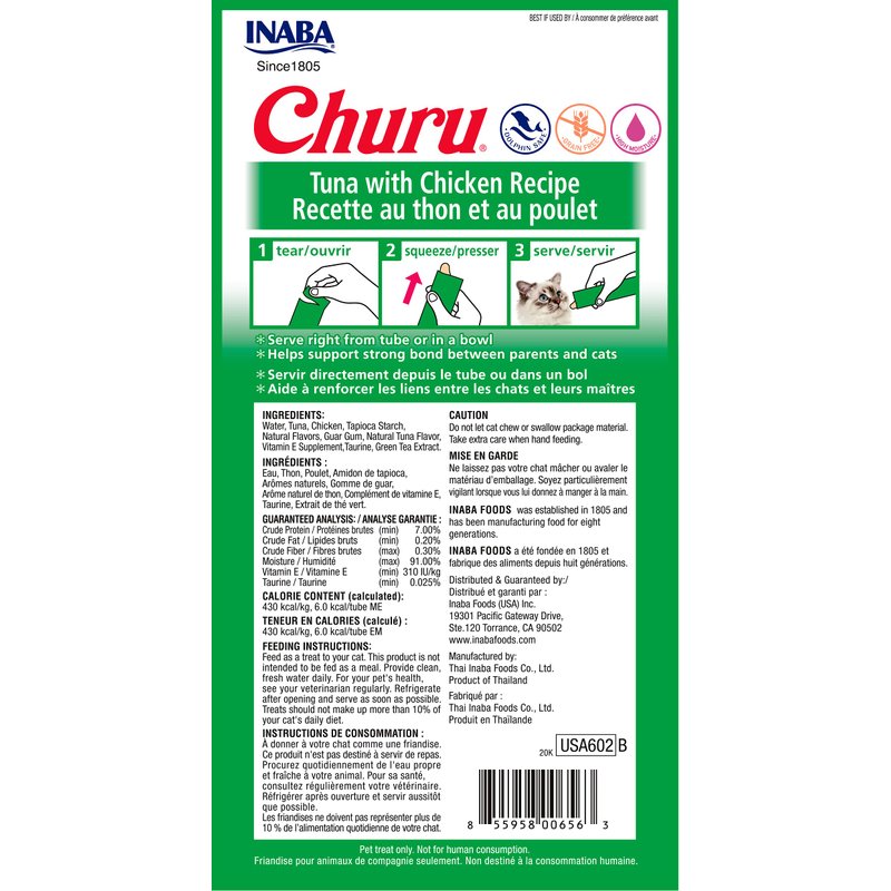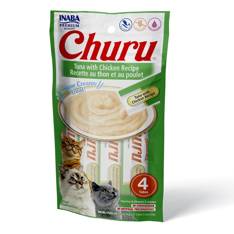 INABA Churu Lickable Purée Natural Cat Treats (Tuna with Chicken Recipe, 4 Tubes)