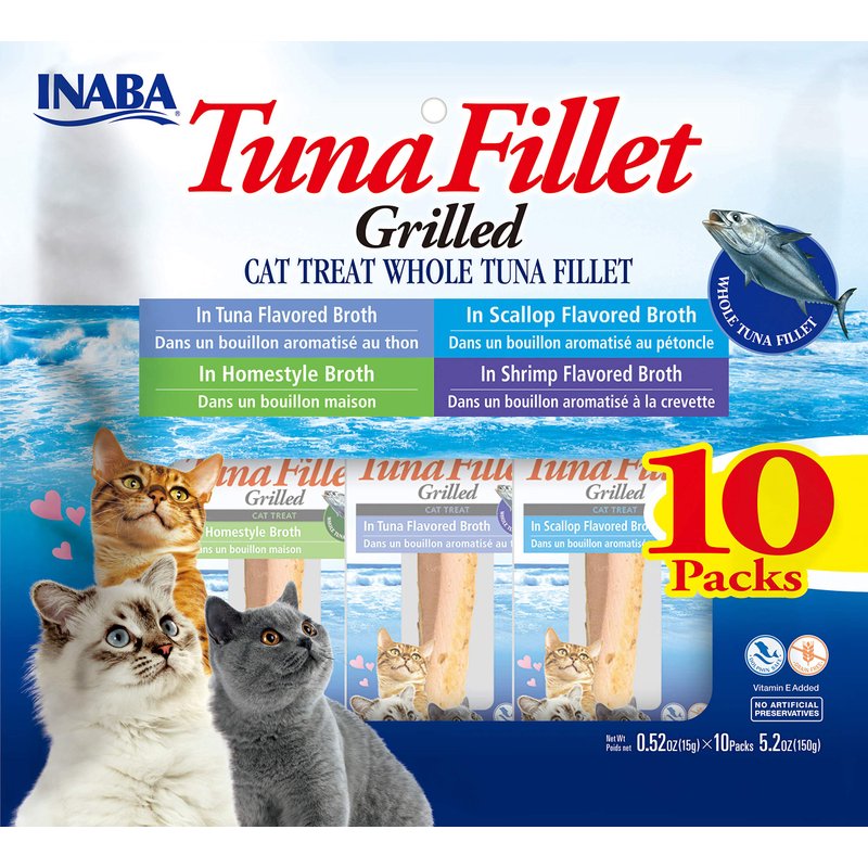 INABA Natural, Premium Hand-Cut Grilled Tuna Fillet Cat Treats/Topper/Complement with Vitamin E and Green Tea Extract, 0.52 Ounces Each, Pack of 10, Variety Pack