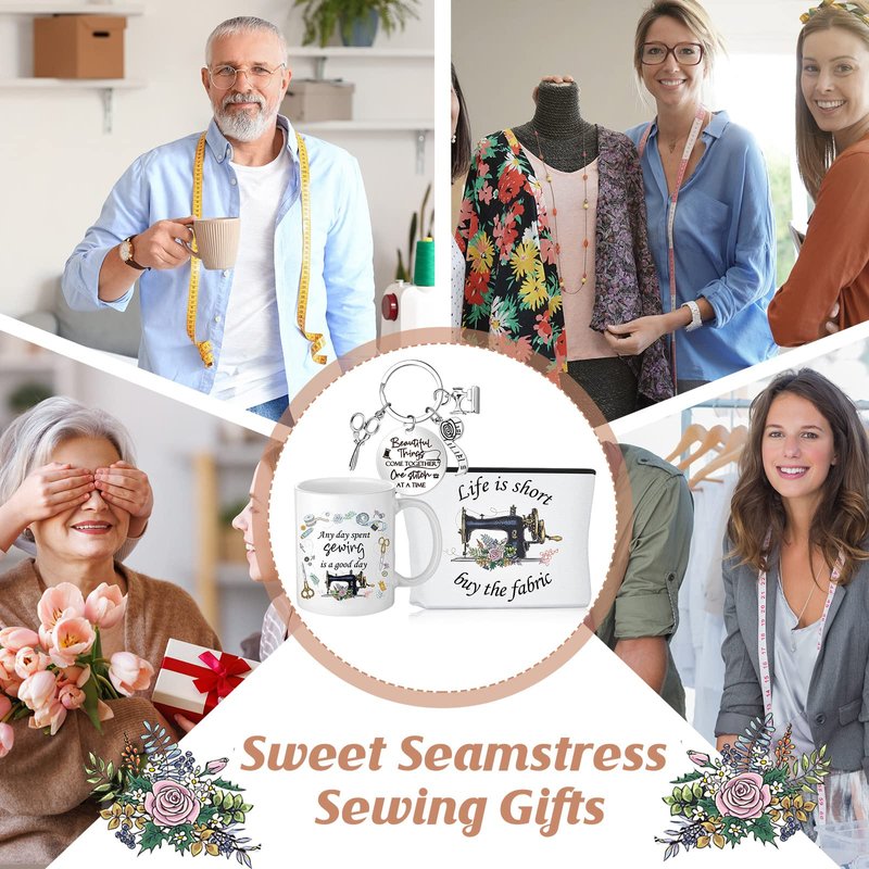 Inbagi 3 Pcs Sewing Gifts for Seamstress Women Cosmetic Bag Quilting Coffee Mug 11 oz Quilter Keychain Funny Gifts for Quilters Sewing Lovers