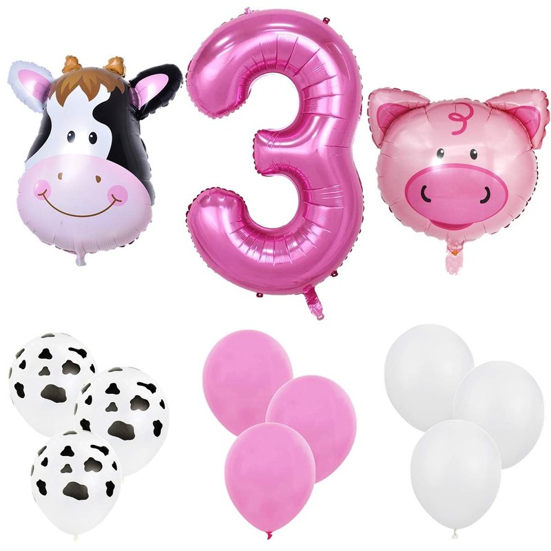 ★ (1) 40 inch Hot Pink Number '3' Foil Balloon ★ (1) 35 inch Cow Head Shaped Foil Balloon ★ (1) 30 inch Pig Head Shaped Foil Balloon ★ (5) 12 inch Cow Printed Latex Balloons ★ (10) 12 inch Latex Balloons - (5 Pink & 5 White)