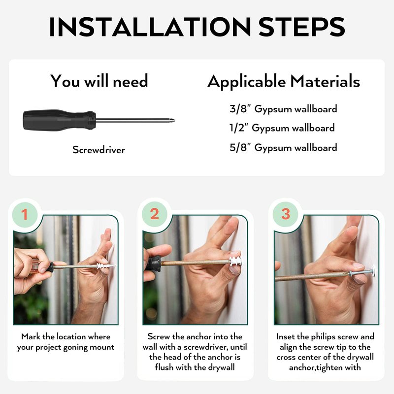- 2.Deep thread design: providing a secure hold and pull-out resistant grip of the wall anchor and screw kit, hold maximum weight of 50lbs, can be engaging in 3/8", 1/2" or 5/8" gypsum wallboard.Can be easily removed