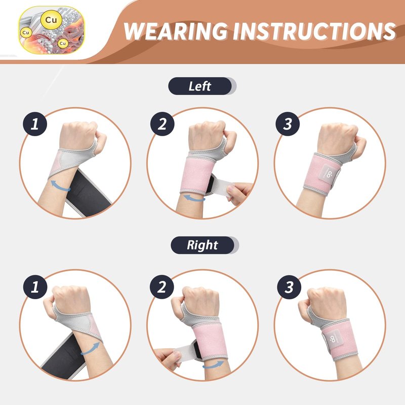 Wrist brace Size: One size Material: Copper ions infused neoprene fabric Suitable for: Men and women, both right and left hand Wearing Instruction: Step 1: Put your thumb into the thumb hole. Step 2: Wrap it from the back direction of your hand. Step 3: Tight the strap and finished wearing.