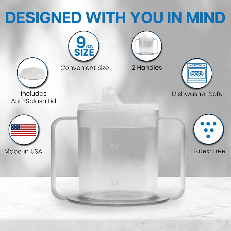 Independence 2-Handle Plastic Mug This attractive mug is crystal clear and exceptionally strong. The handles are easy to hold and the large base adds stability to help prevent spills. Comes with 2 lids: one with a spout and one anti-splash, both usable with a straw. Holds 10 oz of liquid and is dishwasher safe.