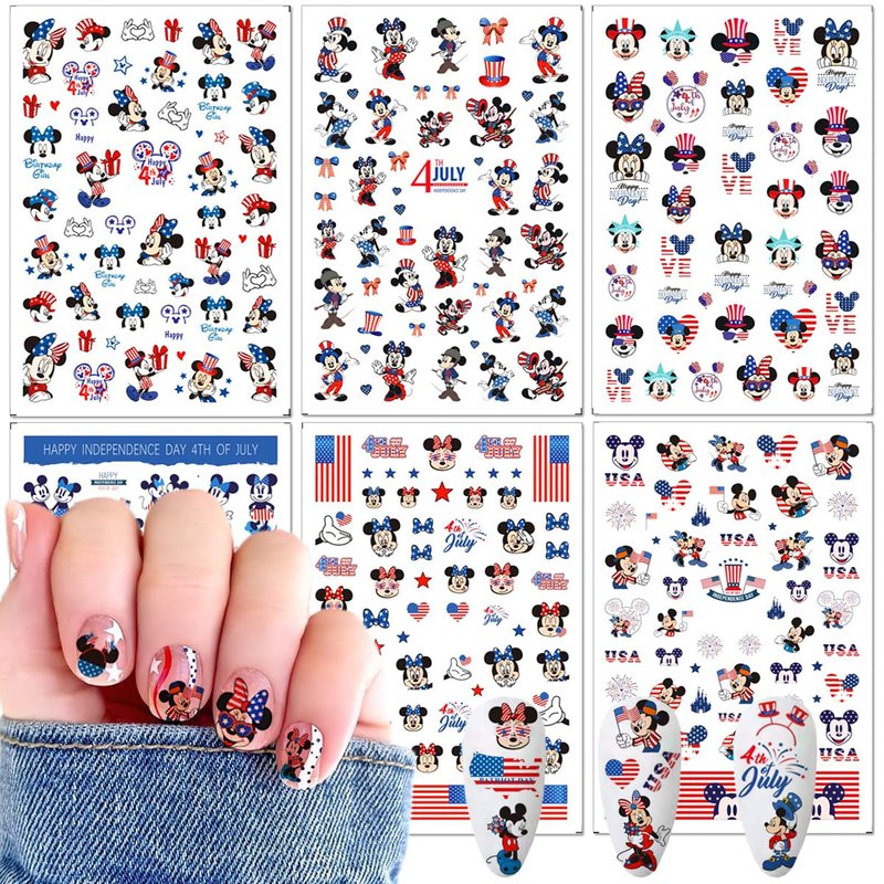 Independence Day Cartoon Nail Art Stickers 3D Self-Adhesive Designer Nail Stickers USA Patriotic Hearts Mouse Nail Design 4th of July Nail Decals for Women DIY Cute Holiday Nail Decoration 6 Sheets