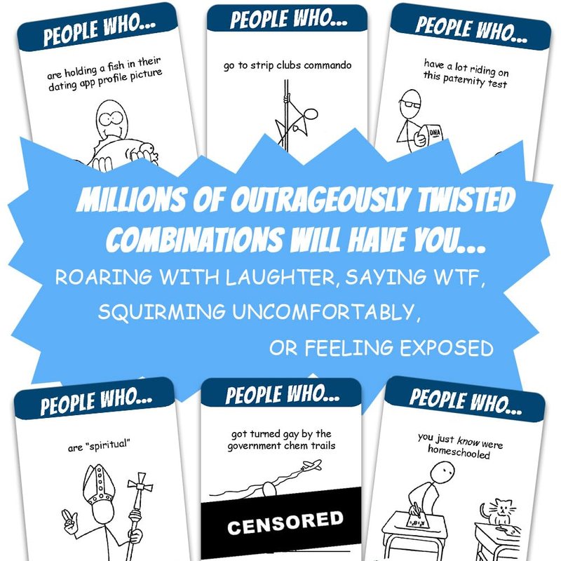 - With a mind-blowing 275 cards, brace yourself for millions of jaw-droppingly perverse combinations that will have you howling with laughter, gasping in shock, or feeling personally attacked! This board game is perfect for families, parties, and groups looking for a popular and hilarious activity. Plus, we've included blank cards so you can create your own over-the-top and boundary-pushing caricatures.
