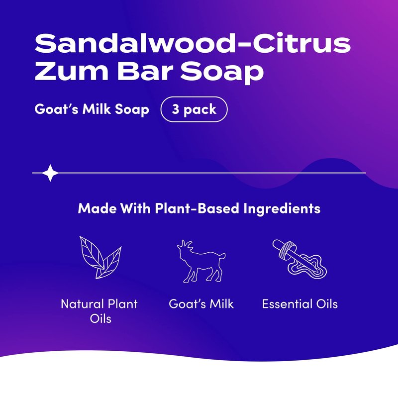 Zum Bars feature plant-packed formulas including saponified 100% food-grade olive, coconut, palm, and castor oils. These natural oils blend together to make a soap that cleans without drying. Plus, the goat's milk adds that extra moisturizing factor your skin will love.