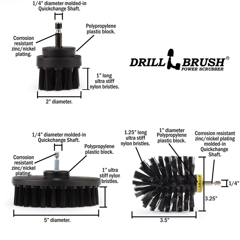 Introducing our industrial-grade black ultra-stiff drill-powered scrubber brush Set, the ultimate companion to your existing cleaning supplies for your heavy-duty cleaning needs. Tired of scrubbing and cleaning tirelessly? Say goodbye to hard work with this powerful electric scrubber that does all the tough work for you. These household cleaning brushes are specifically engineered for surfaces like concrete, brick, stainless steel, and metal. Whether you're removing stubborn dirt, grime, rust, or even graffiti, our sleek black brushes provide maximum scrubbing power. This spin scrubber is not only great for household cleaning, but also for outdoor use, such as grill cleaning kit, graffiti remover, pellet smoker accessories, concrete scrubber, oil stain remover, and more. Using your cordless drill and these power scrubbers for cleaning you create a versatile tool that will become an essential part of your household supplies of cleaning products. This power drill brush kit is great for cleaning Barbecue Grills. This kit includes (3) brushes that all feature quarter inch quick change shafts for use with your own cordless drills. Nylon bristles are safe to ingest unlike competitors metal brushes. Stainless steel wire brushes can break off and get inside your food. Our nylon brush will clean more effectively as it uses all the power of your cordless drill without the risk of contaminating your food with sharp metal wire. These brushes will not rust like metal bristle brushes. Do not use on warm surfaces, only cool surfaces. Cordless drill is NOT included. Don't miss out on this drill scrubber brush kit that will revolutionize the way you clean! Get yours today and enjoy a pristine living space with minimal effort.