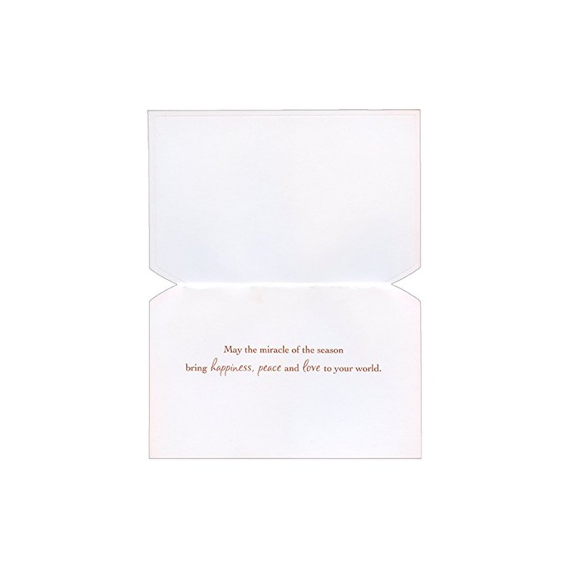 The interior of this Designer Greetings Christmas card design reads: May the miracle of the season bring happiness, peace and love to your world. Each card measures 7x5 inches and is printed on heavy cardstock. The set includes 18 cards and 18 envelopes. The cards have the following special features: gold foil, embossed, die-cut.