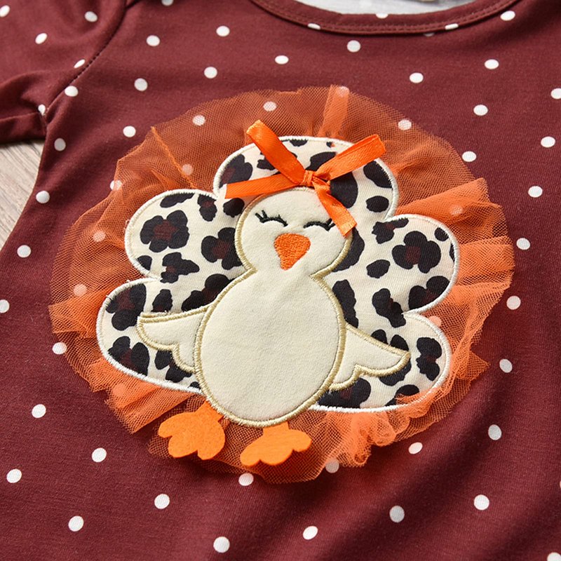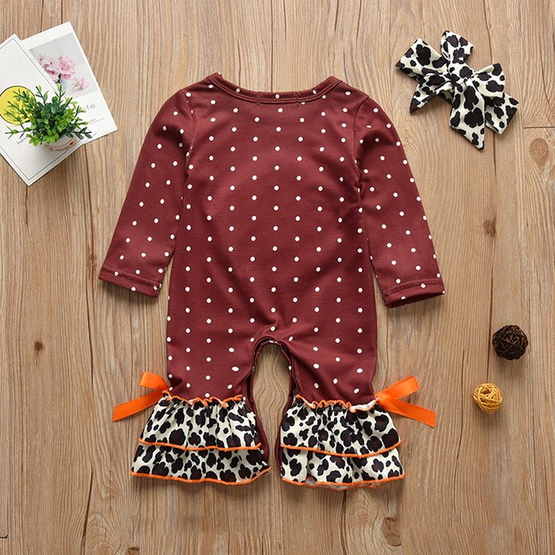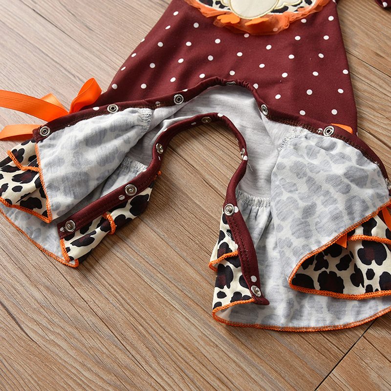 - [Design]Baby girl fashion Thanksgiving one piece long sleeve onesie romper, Thanksgiving romper shirts tops, crew neck, long sleeve, leopard ruffle hem, bowknot decoration, leg parts button down closure design, easy to put on off or diaper changing, dots and turkey patterns are super perfect for the Thanksgiving Day, makes your baby stand out on this Thanksgiving.