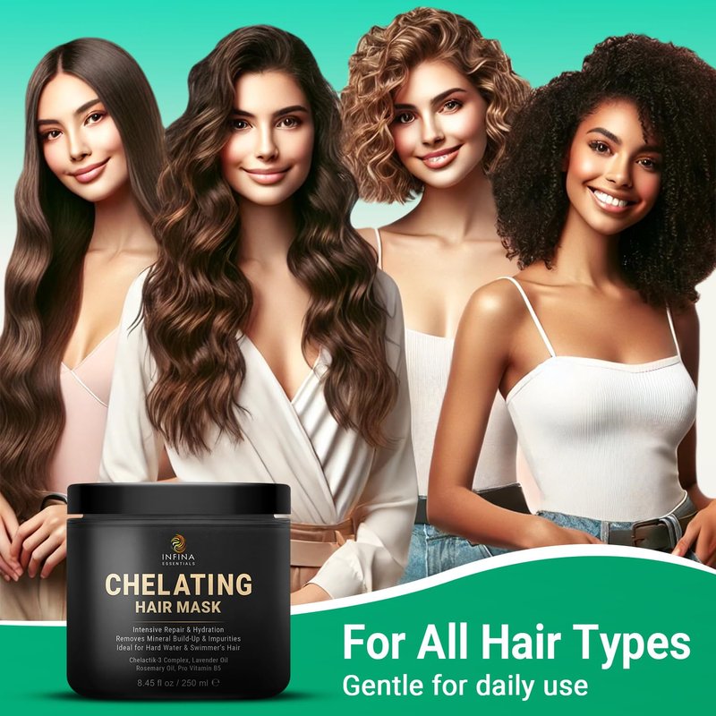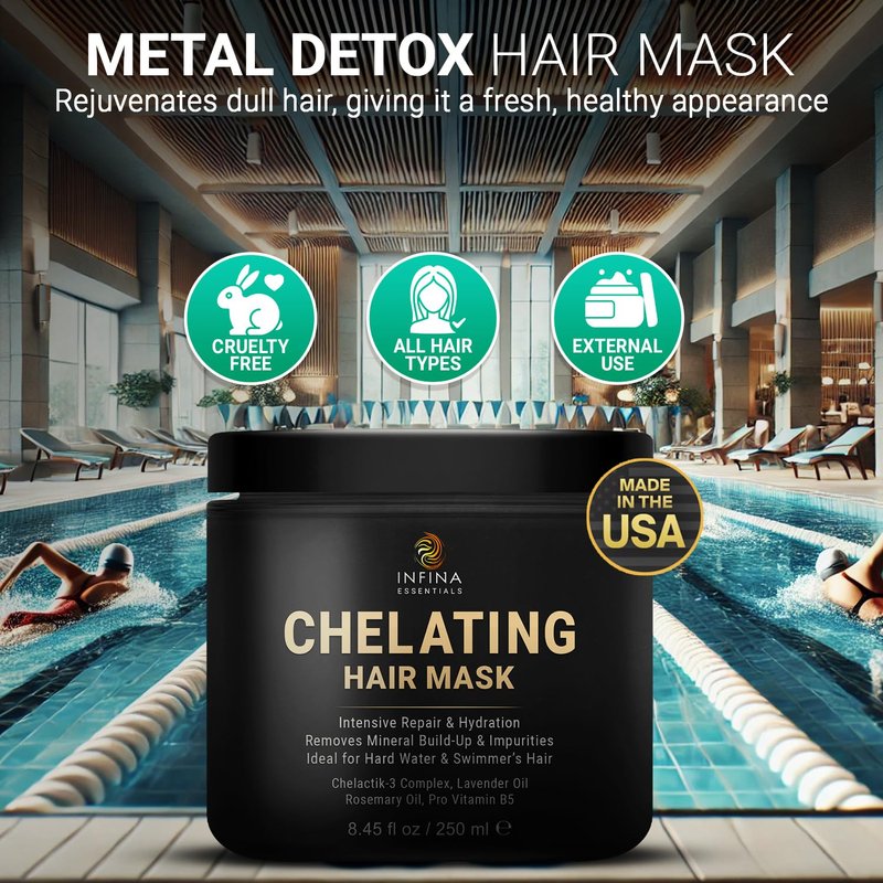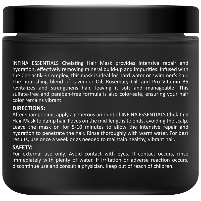 - Chelating Metal Detox Hair Mask: Infina Essentials chelating hair mask effectively tackles hair build-up from hard water, providing a thorough detox for your locks. This metal detox hair mask is ideal for detoxifying hair and scalp.
