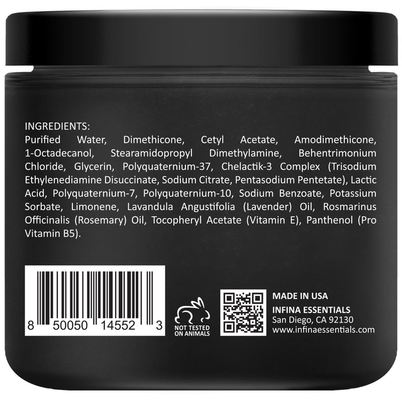 Transform your hair care routine with Infina Essentials Chelating Hair Mask, a powerful detoxifying hair mask designed to remove build-up and impurities. This metal detox hair mask is perfect for combating the effects of hard water, providing your hair with a thorough cleanse. Infused with essential oils like Lavender and Rosemary, and enriched with Panthenol (Pro Vitamin B5) and Tocopheryl Acetate (Vitamin E), this ion hair mask not only detoxifies but also nourishes and hydrates your hair. Whether you need a detox conditioner, a clarifying conditioner, or a moisturizing conditioner, Infina Essentials has got you covered. Ideal for color-treated hair, curls, and all hair types, this hard water hair treatment ensures your locks stay healthy and vibrant. Suitable for adults and kids, it’s a versatile addition to your hair care arsenal. Say goodbye to build-up and hello to refreshed, revitalized hair with Infina Essentials.
