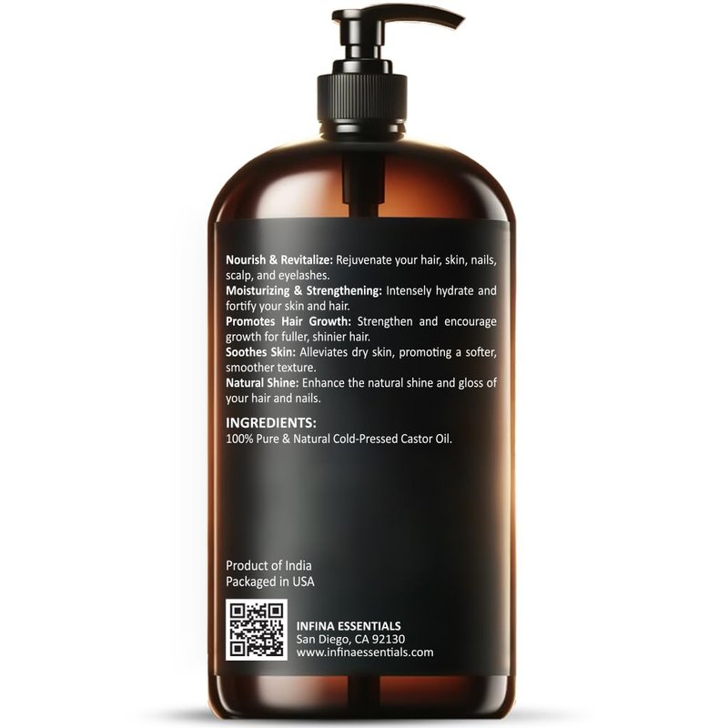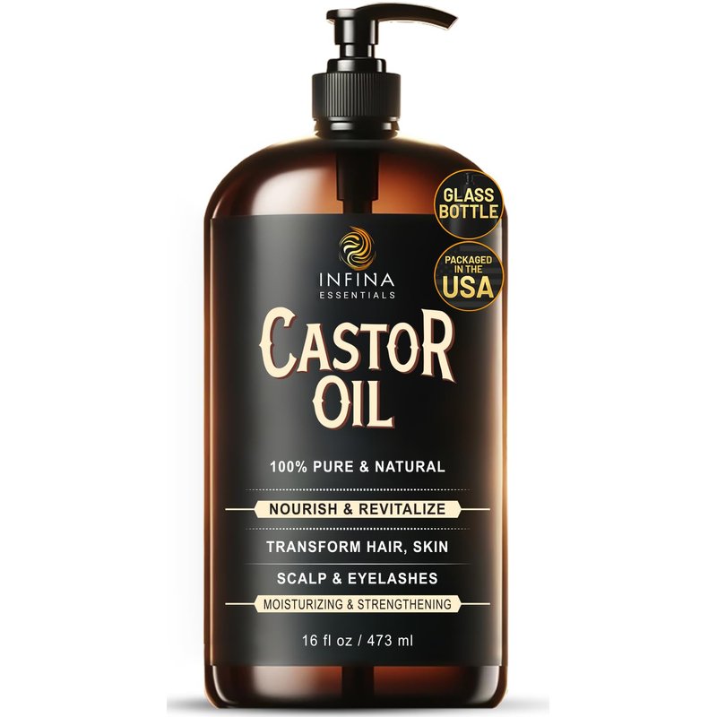 INFINA ESSENTIALS Pure Castor Oil for Hair Growth, Scalp, Skin, Face & Eyelashes - 100% Pure Hexane Free Cold Pressed Castor Oil Glass Bottle - Nourish & Moisturize Hair & Skin - 16 fl oz