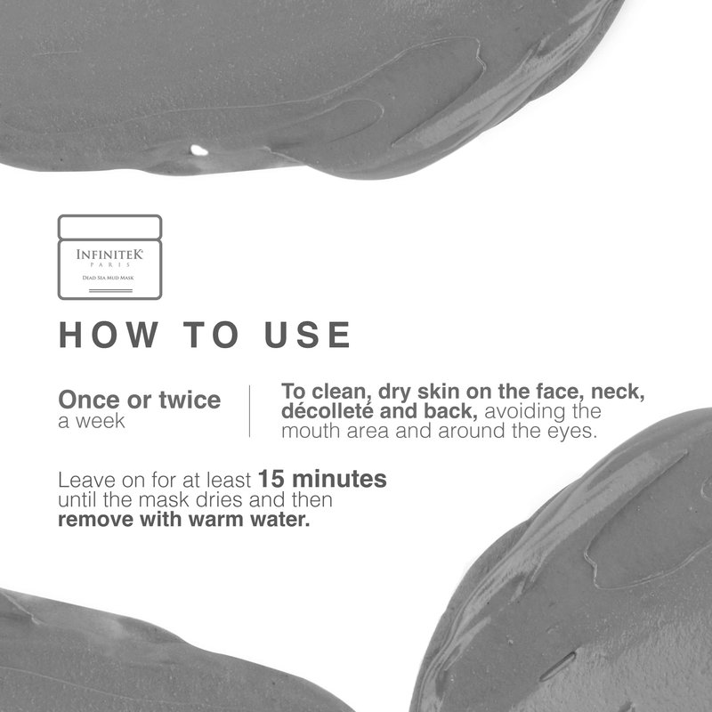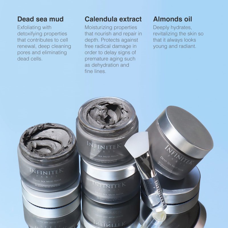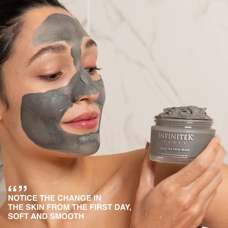 - SKIN CARE PREPARATION: Dead Sea mud mask with Vitamin E and Shea. Apply it directly on your face, neck, low neck, and back. Improves dark spots, blemishes, wrinkles, oily skin, and dilated pores. Combats premature skin aging. Infinitek offers anti-aging skincare products.