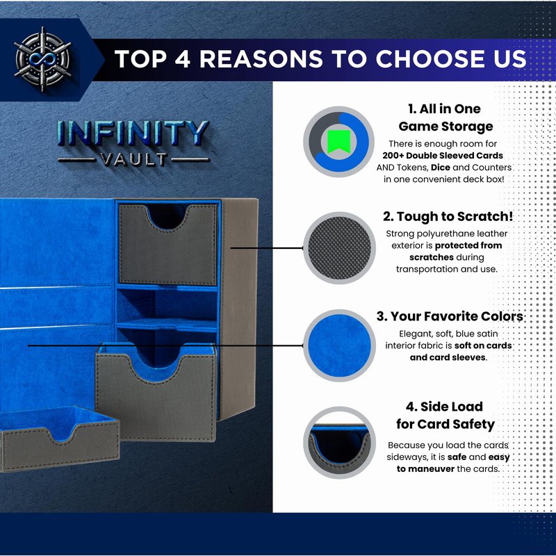All our products at InfinityVault are designed with the highest quality standard. This deck box in particular was designed to first and foremost protect your cards, from its strong damage-resistant exterior with magnetic box closure, to its soft interior, including spacious trays that will not be the cause of scrunched card corners or sleeves.