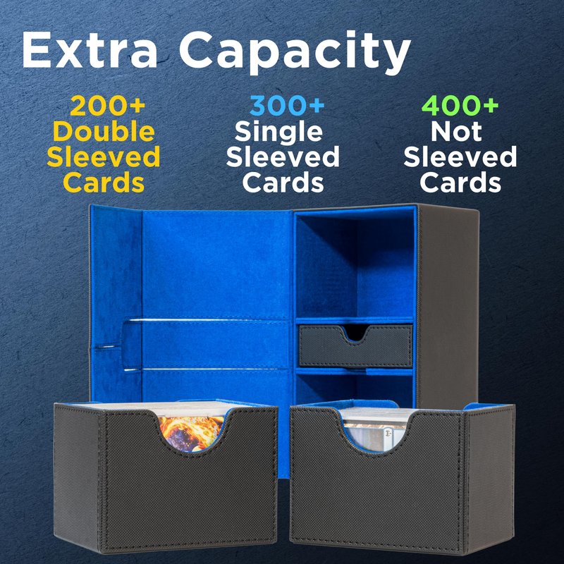 - Convenient All in One Deck Box - Everything you need for game time fits in this box. We studied the capacity of existing deck boxes that were not up to par, and we designed this deck box to comfortably store at least 100 Double Sleeved cards in each of its two sideloading card trays. The box includes an accessories tray to accommodate your needs for any additional required card storage space, dice, tokens, counters, and other accessories specific to your game.