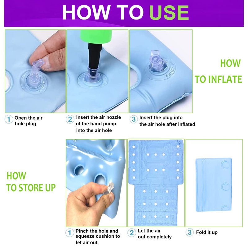 - 【Inflatable Seat Cushion】Our chair cushion can be inflated fast with the included hand pump. You can easily adjust the air level and firmness for your specific body type by adding or removing air. Deflation is as easy as Inflation. Just pinch the mouth of the valve and squeeze the cushion to let air out quickly.