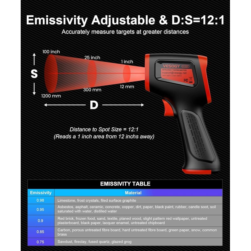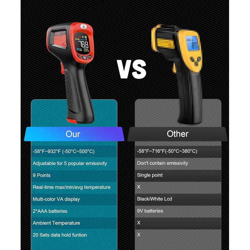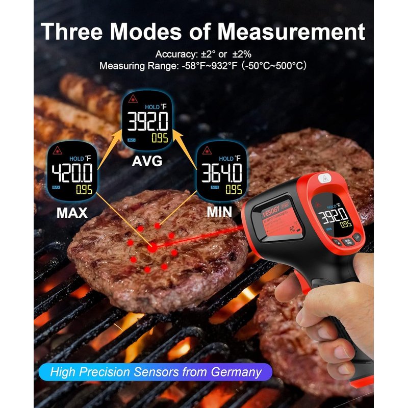 - Easy to Use - Simply scan the surface of your object, hold down the trigger of the IR thermometer gun, and release to get live temperature readings anywhere between -58°F and 932°F ( -50°C and 500°C ), Meanwhile the Max/Min/Average mode is specially set to let you know live the Max/Min/Average temperature in the area you need to measure.