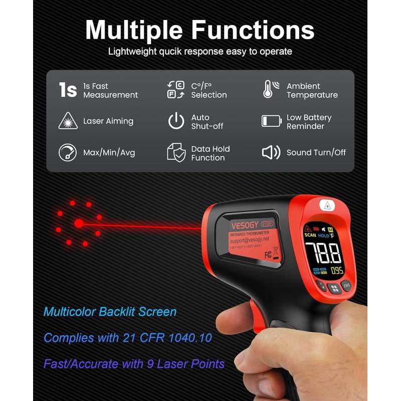- Versatile Design - Infrared technology makes it to measure the surface temperature of various objects especially temperatures above boiling points and below freezing points. Use it for cooking, ovens, AC, refrigerators, soapmaking or pets toy etc.